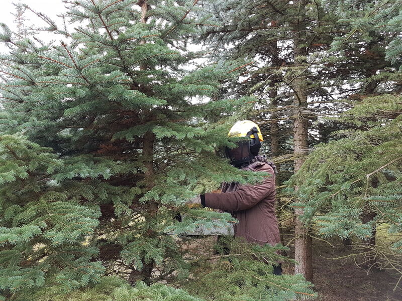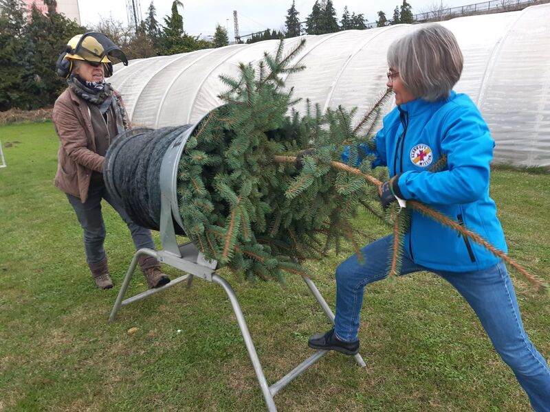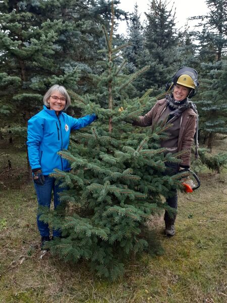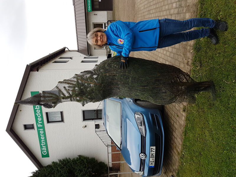 Die Gärtnerei Fredebold aus Rössing hat der Bahnhofsmission in diesem Jahr einen Tannenbaum gespendet. Den Baum durfte die Leiterin der Bahnhofsmission in der Schonung der Gärtnerei aussuchen. Frau Fredebold selbst griff daraufhin zur Motorsäge und fällte das auserwählte Exemplar.